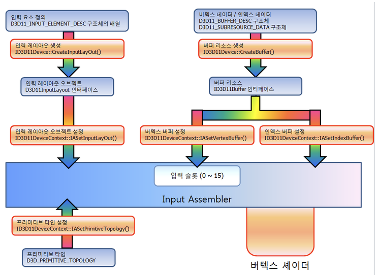 IA단계는 랜더링 파이프 라인에서 가장 먼저 시행되는 단계이다. 이 단계에서 Device에서 생성한 VertexBuffer나 IndexBuffer의 데이터를 읽어들여 Primitive를 조합하여 파이프라인의 다음단계인 VS에 데이터를 전달하는 역할을 한다.