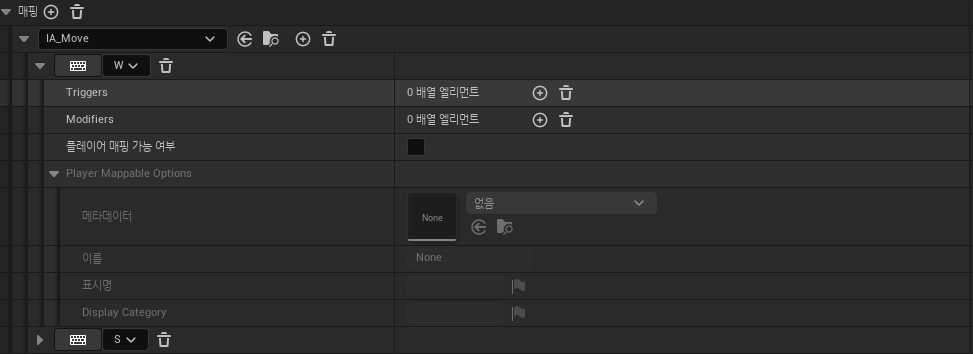Input Action은 행동을 정의하는 단계였다면 IMC는 이러한 행동들을 묶어주는 역할을 한다. 기존의 바인딩 인풋에서 인풋을 바인딩하는 형태와 매우 유사하다. 인풋 바인딩에서는 키를 바인딩하고 스케일을 넣어주는것만 가능했던 반면 IMC는 매핑에 따른 옵션을 넣어줄수 있다는 점이 차이점이다.