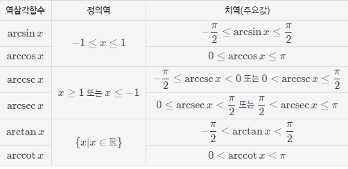 ※주의) arcsin(역함수)와 csc(1/sin)은 같지 않으므로 혼동에 주의해야된다.